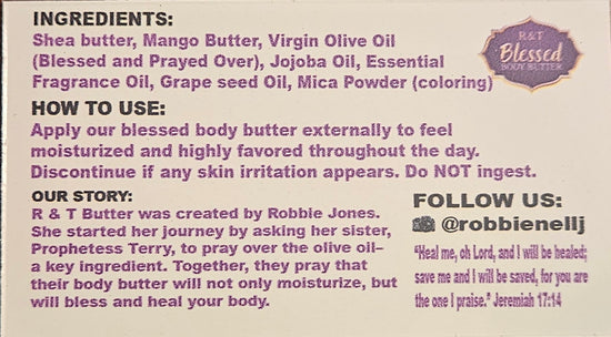 R & T Body Butter was created by Robbie Jones. She began her journey by asking her sister, Prophetess Terry, to pray over the key ingredient—Olive oil. Together, they pray that their body butter will not only moisturize but also bless and heal your body.